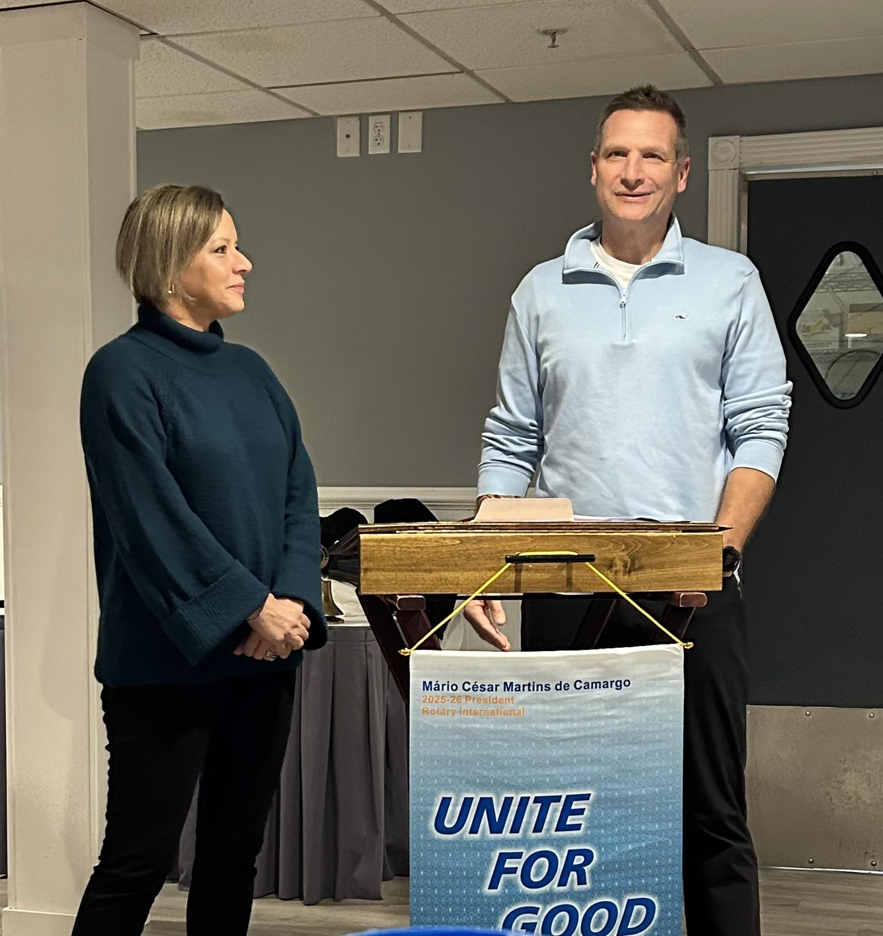 The Saco Bay Rotary Club welcomed Nancy and Eric Marston as our guest speakers at our weekly meeting. They shared information about their non-profit Hoops for Hope which just finished its 11th annual fundraiser event this month raising a record amount of over $40,000. Hoops for Hope is a local charity organization that assists those affected by cancer. The money raised directly benefits cancer patients and their families. Financial assistance is provided in many forms: payment of medical and utility bills, gift cards, gas cards, purchase of wigs and other support. For more information, visit www.hoopsforhopemaine.com