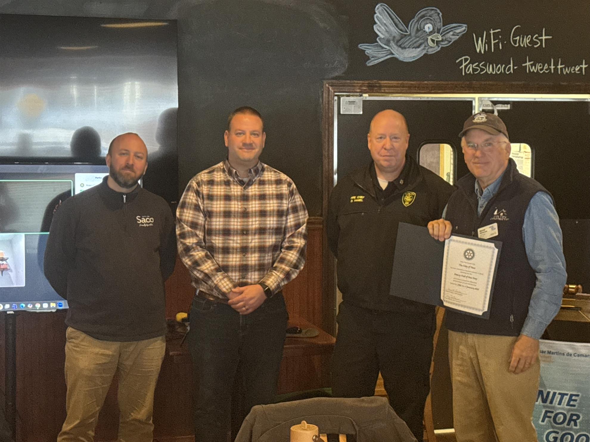 The Saco Bay Rotary Club was honored to induct our first Corporate Members - The City of Saco. Rotary President David Arenstam and a team of Rotarians inducted our newest members at our weekly meeting held at Birdie's Tavern. Welcome City of Saco!!